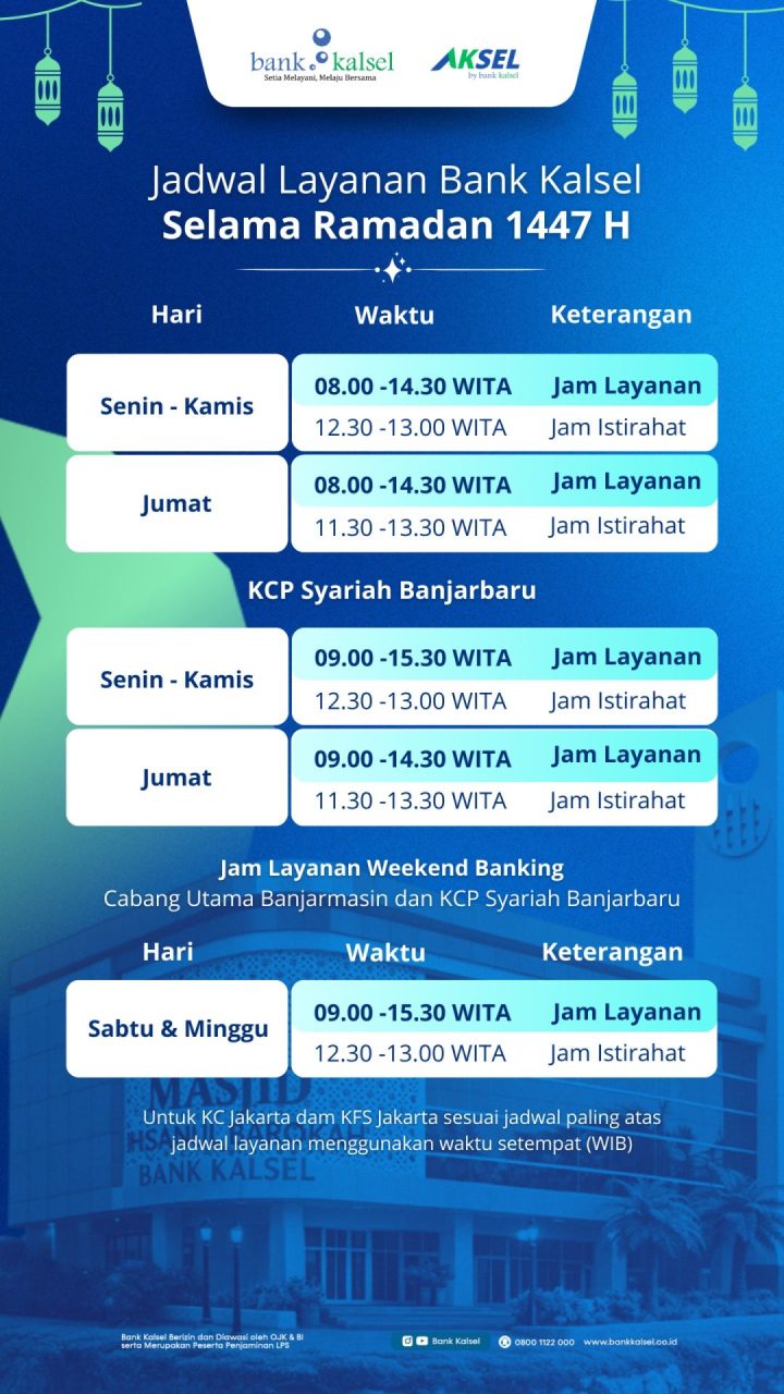 BANJARMASIN, ONENEWSKALSEL – Memasuki penghujung Ramadan 1447 Hijriah, Bank Kalsel mengajak masyarakat, khususnya para nasabah dan kalangan milenial, untuk mengoptimalkan ibadah pada 10 malam terakhir yang dikenal penuh keutamaan.